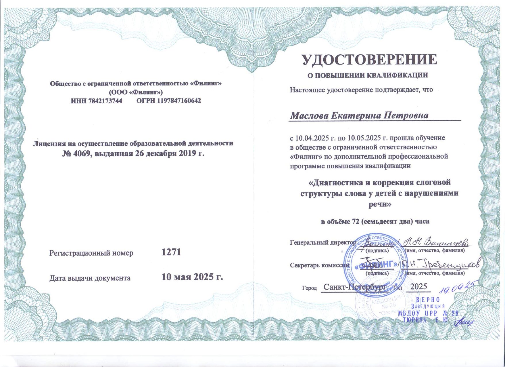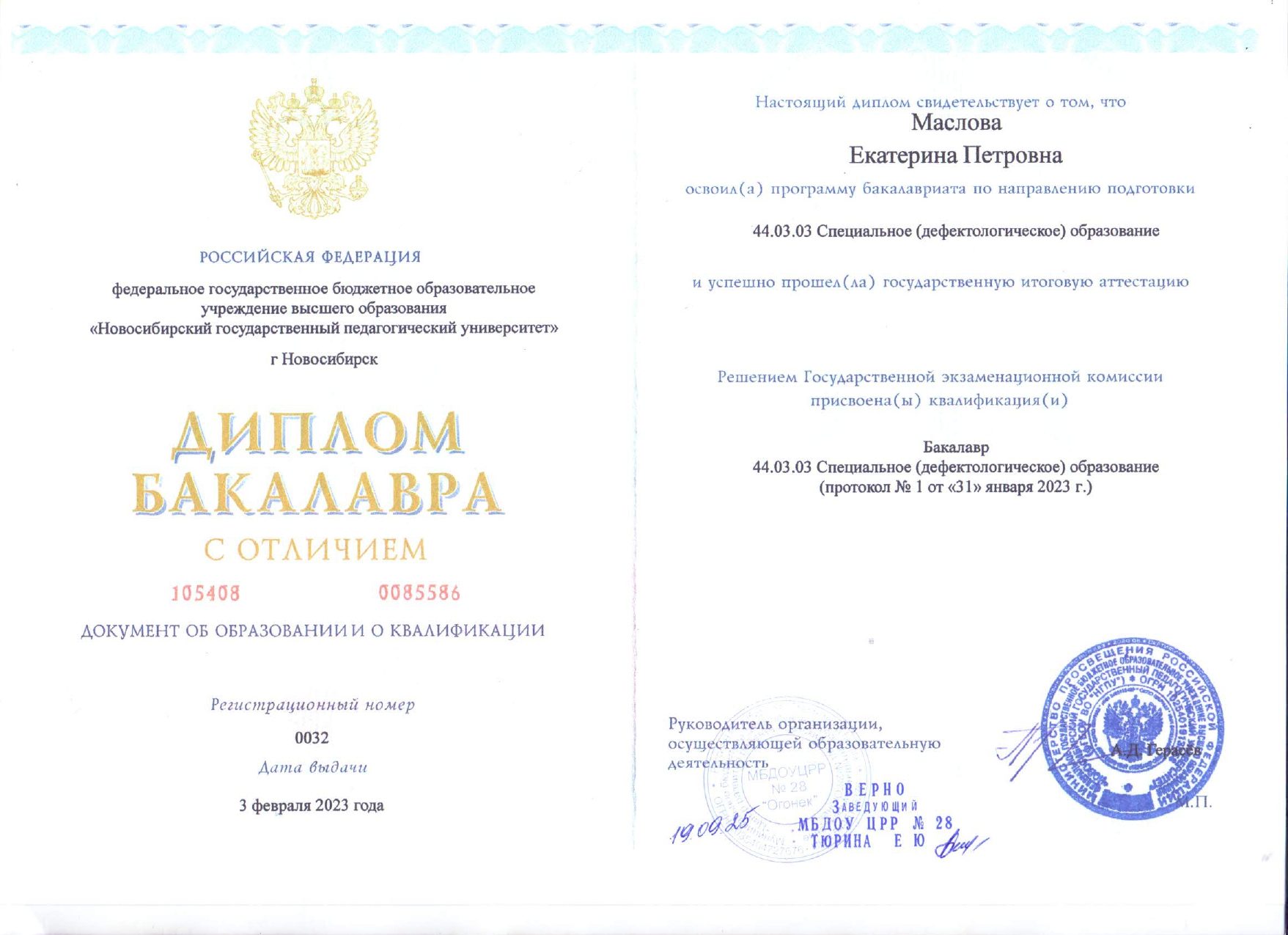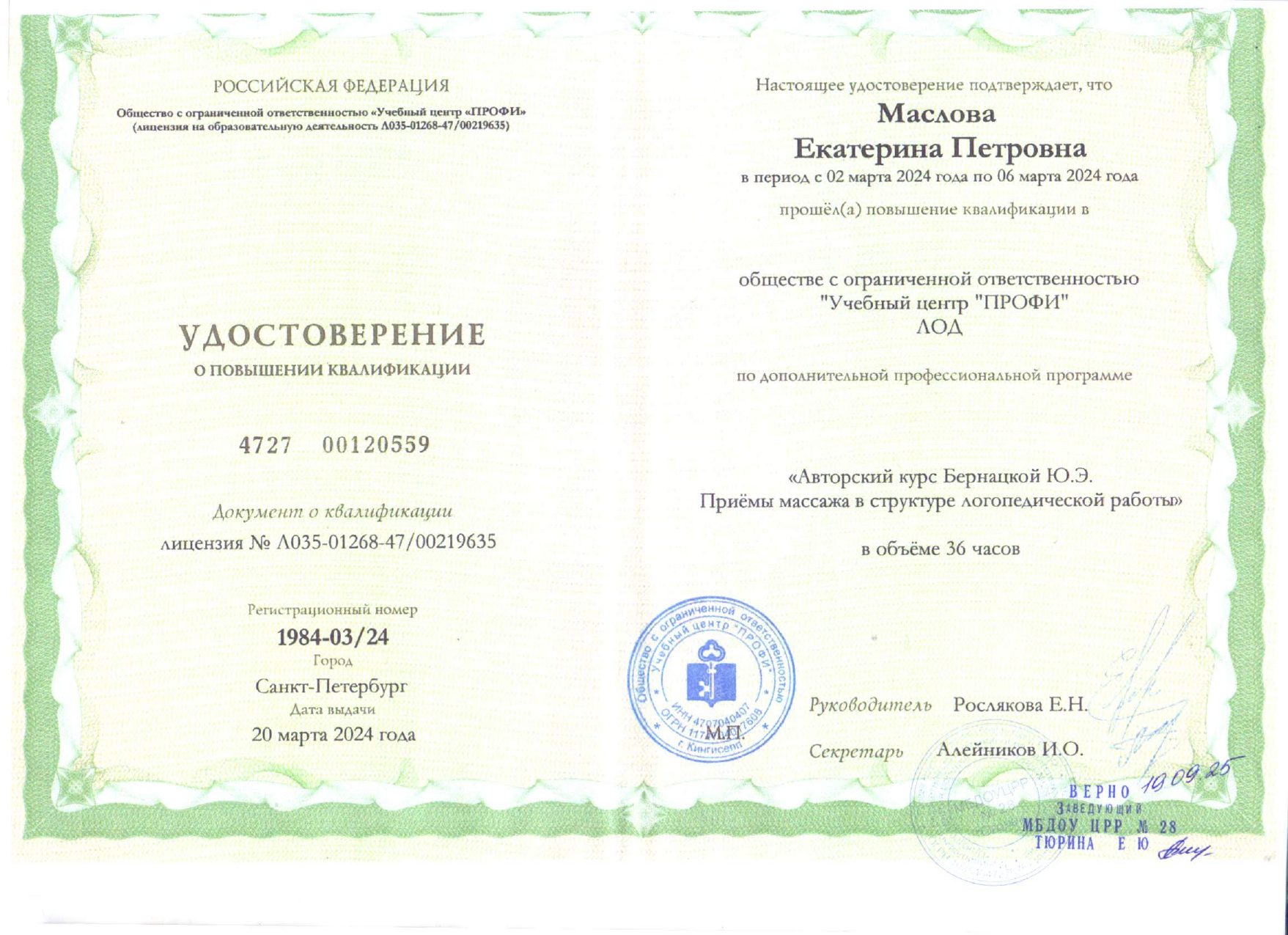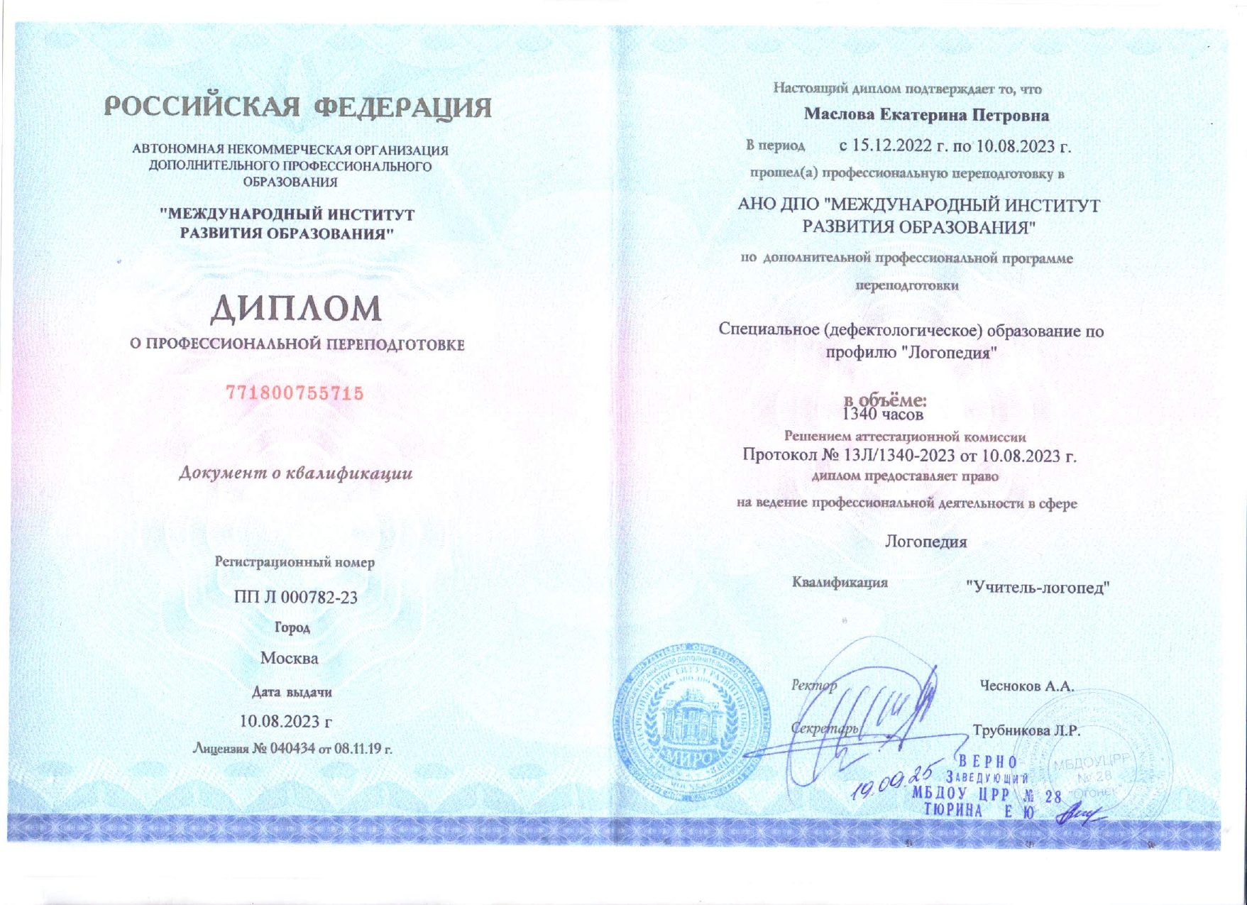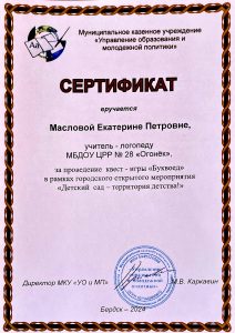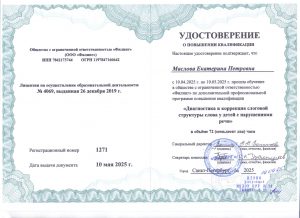 Маслова Екатерина ПетровнаУчитель-логопед Образование: Новосибирский государственный педагогический университет, 2009 г. Направление подготовки и/или специальность: Специальное (дефектологическое) образование Сведения о профессиональной переподготовке: Категория: без категории Повышение квалификации: